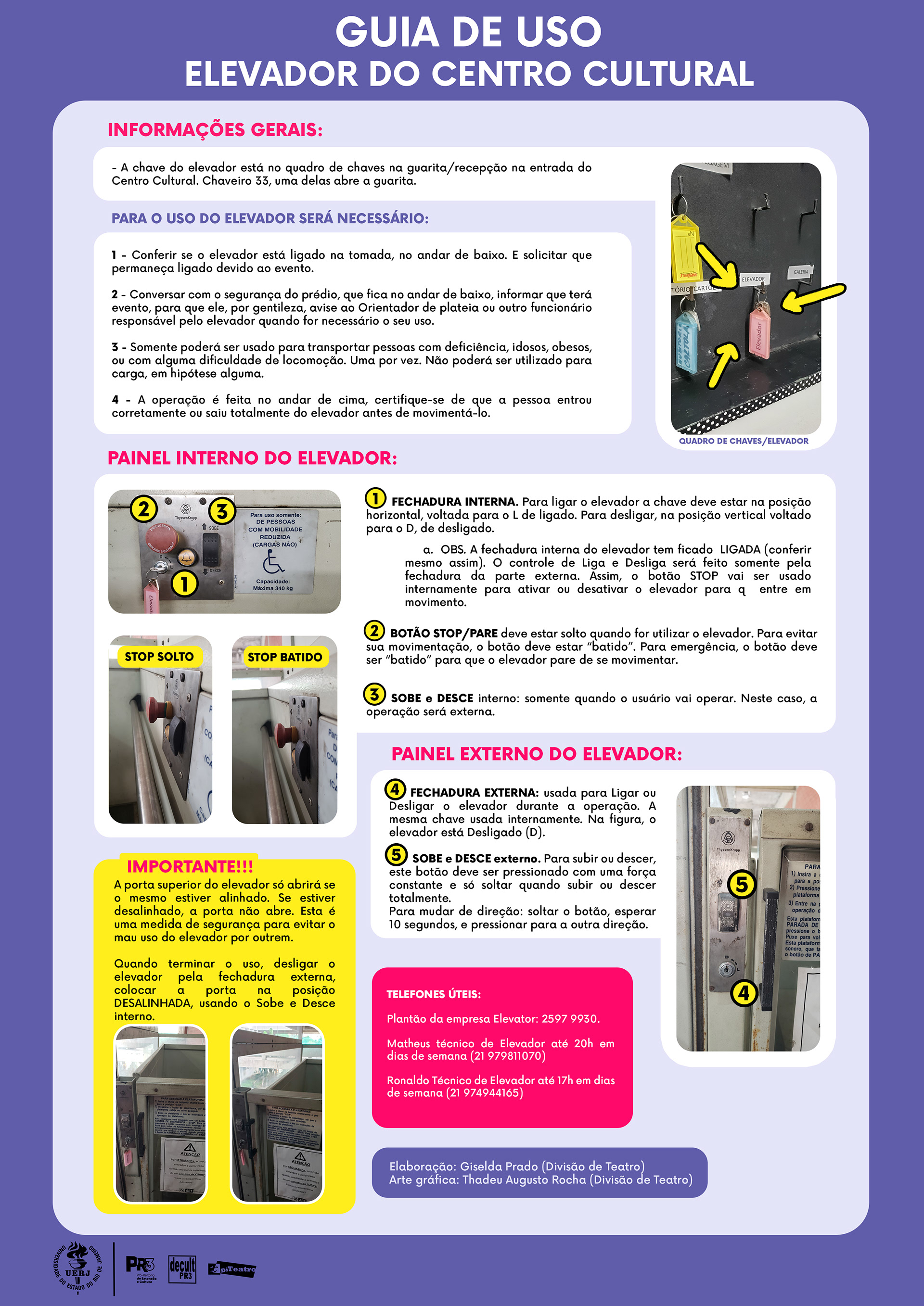 Infográfico desenvolvido para guia de uso do elevador do Centro Cultural da UERJ.
